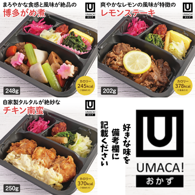 ど冷えもん対応のおかずのみのお弁当です。博多がめ煮・レモンステーキ・チキン南蛮がございます!